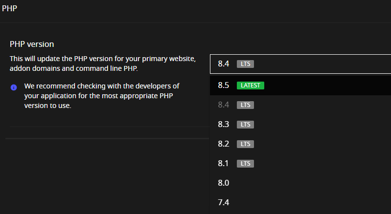 支援從 PHP 5.6 到最新的 PHP 8.5,您可以針對每個網站獨立設定 PHP 版本,確保最佳的相容性與效能。